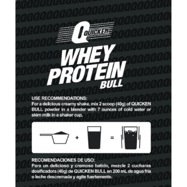 Modo de preparación: Para un delicioso y cremoso batido, mezcle 2 cucharas dosificadoras de Quicken Bull en 200mL de agua o leche descremada y agite fuertemente.